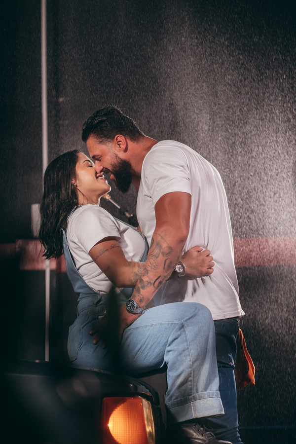 O ensaio da Ana e do Everton provou que a beleza está na conexão. Ver a noiva de branco em meio ao cenário industrial da oficina criou uma estética editorial única, que foge completamente do óbvio e imprime a personalidade exata de quem eles são no dia a dia.
